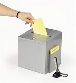 Metal Ballot Box W/ Side Pocket, Pen & Lock, Wall Or Countertop – Silver