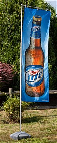 These outdoor flag pole stands that hang banners, also called flying pennants, bring the most visually appealing information to life by towering 10 feet tall. Like the retractable banners, the trade show displays are sturdy and long-lasting. These outdoor flag pole stands that promote a company, business, event, special or information are ideal for people looking to get their name out there in a giant way. Printed artwork with a unique or eye-catching design will enhance the value of this unique product (see related options on right side). The flying design stand is crafted from molded plastic and aluminum and features plastic hooks to clamp your flag’s grommets into place. The base can be filled with sand or water to weigh it down during windy weather. The outdoor flag pole stands that towers over crowds are lightweight, easy to assemble and break down to save time.