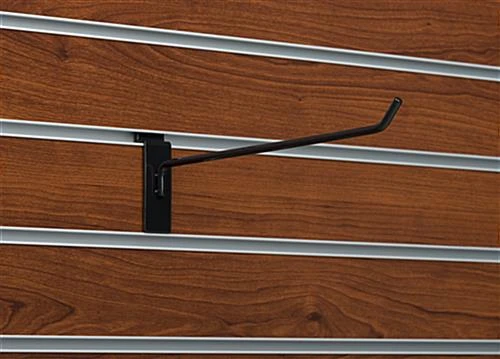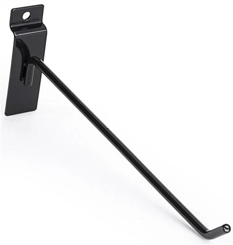 Organize your retail inventory with help from this slatwall 10” black peg hook hanger. Sporting a glossy finish and metal construction, each store fixture can support a variety of merchandise. The 30° upward tilted edge keeps products from falling off of the durable metal 10” black peg hook hanger.