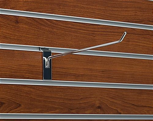 Display accessories in an organized manner using this 10” chrome peg hook hanger for slat panel. Your products and merchandise remain in place thanks to the 30° upturned tip. Each metal chrome peg hook hanger fit standard slatwall store fixtures for a versatile inventory showcase.