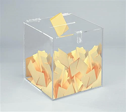 This large clear acrylic lead box, ballot box measures (12″ cube) with a hinged hasp for a pad lock. The slot size on this ballot drop box is 6.25w” x 1/2″. This sweepstakes entry box, also known as a donation box is a perfect countertop display. These transparent lead boxes are often used in town halls as well as for all types of voting in companies.