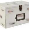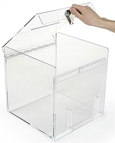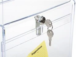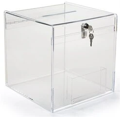 This plexiglass donation box (12″ cube), also known as a safety suggestion box, comes with a key lock and a 6-1/4″ wide pocket for convenient storage of ballot or comment cards. The slot size on this sweepstakes entry box is 6 1/2″w x 1/2″d. This ballot box is also used as an employee suggestion box to collect comments and ideas.