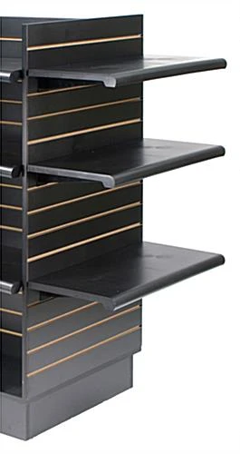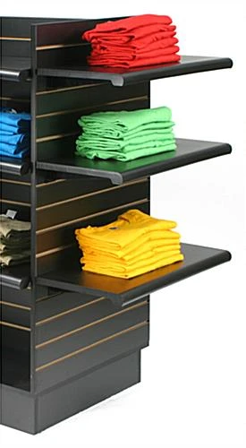 Like our other slatwall shelves and brackets, these bullnose shelves require no tools, adhesives or mounting materials to attach. With an open bottom design, they simply sit on top of your brackets to display your merchandise. You can add or remove each bullnose shelf to your retail display within seconds. Sturdy, yet lightweight, these bullnose shelves can hold a variety of small to medium sized products without bending or bowing. Use your bullnose shelving to display clothing, food products, books and more. In addition to these black slatwall shelves, we also sell bullnose shelves in several other sizes and colors.