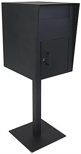 Our pedestal drop box is made of powder-coated steel, making it durable enough to be used indoors or outdoors at libraries, schools, shipping centers, and property management offices. The heavy-duty steel bin features a rubber gasket around the top door to protect the contents inside from inclement weather conditions and closes automatically between uses. This secure locking pedestal drop box is delivered partially intact, allowing for minimal assembly. Two keys are included with the unit, making it easy for property management offices or facilities departments to maintain the interior contents. The base of this locking steel bin also has permanent mounting holes allowing for additional stability in high-winded environments. Our heavy-duty, secure pedestal drop box is the perfect solution for book returns, rental key drop-offs, and more!