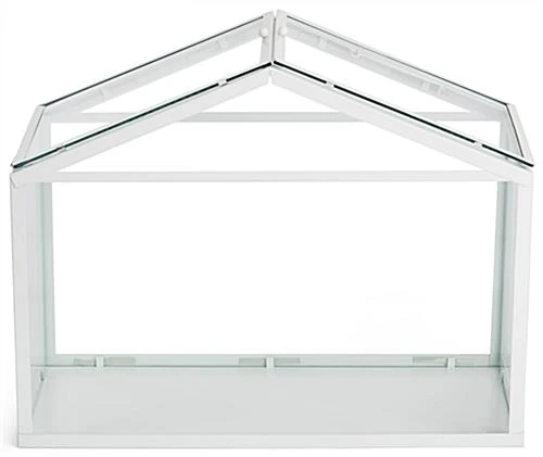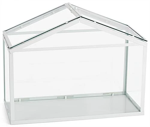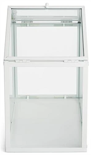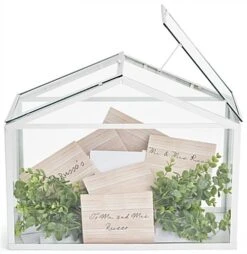 Our glass wedding money card box measures 17.75″ wide by 14″ tall, providing you with ample space to collect gifts, envelopes, or simply decorate with keepsakes. Perfect for bridal parties, baby showers, and birthdays, this house shaped case consists of a durable iron frame with glossy white finish and clear window panes that allows this fixture to hold up to 4 pounds of weight while keeping inserts safe from the harsh conditions of a busy environment. This wedding money card box for countertop placement features two hinged doors with propping bars that can be left open for easy collection of entries or closed when not in use. Doubling as a decorative display case, you can create terrariums or place art prints, photos, or valuable keepsakes inside this fixture with clear visibility of contents on showcase. Elevate this wedding money card box by adding coordinating custom printed graphics that can be personalized with names, dates, event information, and logos (sold separately). Stage this decorative house shaped case at your next special event to captivate guests’ attention and provide them with a designated showcase to place donations and gifts.