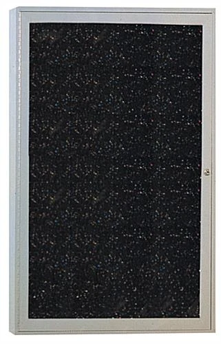 An enclosed noticeboard, cork board, tack board, and other event notice boards are designed to help keep the community aware and informed. This noticeboard features a durable anodized satin aluminum enclosure with a locking hinged door for added security. A noticeboard like this event board has a piano hinge the entire length of the door to keep it from sagging, as well as a shatter resistant acrylic lens to keep your postings protected from tampering. The frame and self healing rubber surface of this noticeboard are constructed from post consumer materials making this a “green” product. “Green” products that feature recycled materials, like this noticeboard, are a perfect way to help reduce your carbon footprint. The rubber surface of this bulletin board has a confetti look (black with specks of color), is colorfast, resists stains and fading, and is easy to clean.