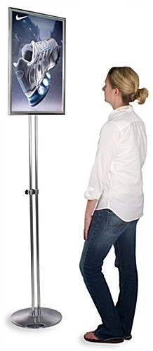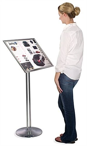 This poster display adjusts in many ways to create a customized sign holder. With an adjustable height and tilting frame, this poster display is designed to hold 18″ x 24″ signs. Each poster display features a double metal pole stand, matching base, and a snap open frame for easy graphic changes. With a shiny chrome finish, this poster stand is perfect for upscale and trendy environments. We sell each poster display with a non-glare lens to protect your graphics.
