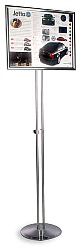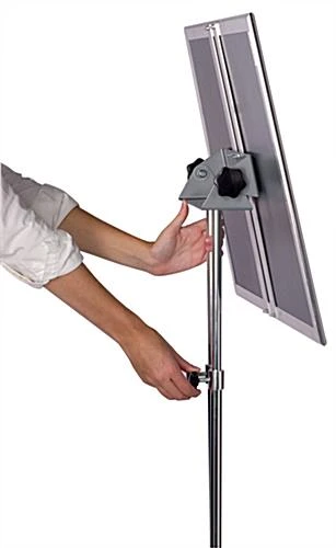 This poster display is a versatile and multipurpose sign stand. Each poster display features an adjustable height that can move up and down to a position that you choose. This display stand can also hold the frame in the portrait or landscape position. The sign frame tilts a full 180 degrees and can be placed to any desired viewing angle. Extend the height to eye level and use as a poster holder, or drop the height and tilt the frame back to use as directory or menu stand.