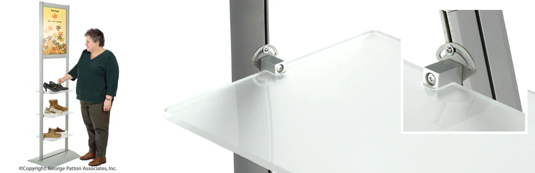 This merchandise shelving takes a typical shelving unit and amplifies its promotional capabilities with its large, graphic area. This sign fixture, merchandise shelving features (3) shelves, constructed from frosted acrylic. Having a frosted finish gives your fixture additional sophistication and appeal! This merchandise shelving, also known as an advertising stand, is a great fixture for generating interest in new or promotional products. You can even use it to help distribute sample items or promotional gifts.