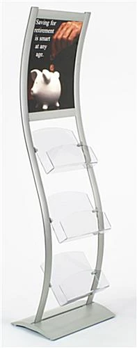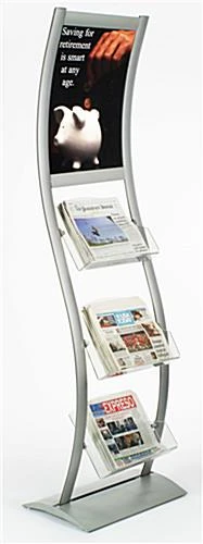 This wave rack is constructed from brushed aluminum and features a beautiful, silver finish. Not only will the aluminum resist rust, when used indoors, it will also look sleek! The periodical display, wave rack uses clear acrylic pockets to hold your catalogs. The clear acrylic is great, as it enables users to view headlines. This literature stand is also an adjustable wave rack, with its moveable clamps. Simply slide the brackets up or down each side support, until you reach a desired height for your acrylic pockets. We even provide the wave rack with (2) clear, plastic lenses to protect your graphics. You can also use these lenses to create a double-sided display! This wave rack, such as our other wave-shaped systems, adds a modern appeal to any store décor.
