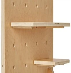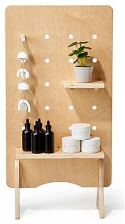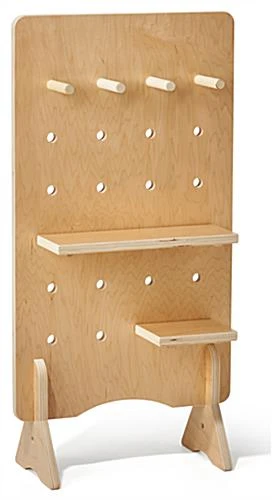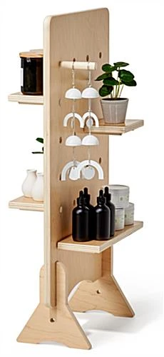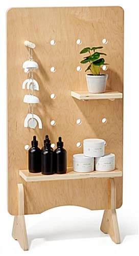 Use our wooden pegboard with shelves to keep your best-selling products front and center in retail stores, boutiques, trade shows, craft fairs, and much more. Each countertop display stand features an eco-friendly natural wood laminate finish that stands out from existing fixtures while effortlessly blending in with any space’s decor aesthetic. Without sacrificing quality or durability for a lower impact on the environment, our double-sided pegboard with shelves is thoughtfully handcrafted from sustainably grown plywood that can withstand the conditions of a busy shopping environment. Whether you need to display home goods, jewelry, stationery, or small accessories, this modern flat-pack shelving comes with four shelf attachments and 18 repositionable pegs to create quick custom visual showcases when needed. This eco-friendly pegboard with shelves and convenient collapsible design can easily be assembled and disassembled without the use of any tools. Additionally, use the included flat-pack carrying case to transport this lightweight countertop display to and from traveling events or store away when not in use. Stage this modern natural wood shelving within your retail space to create an elevated visual showcase that will make your merchandise stand out amongst any crowd!