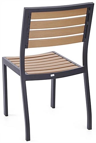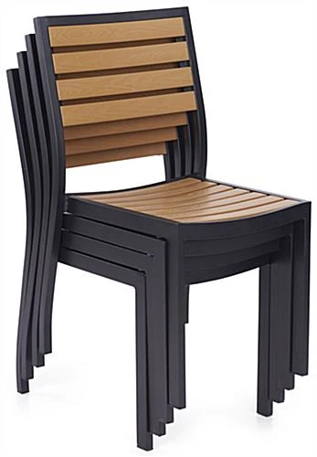 Our aluminum and faux teak patio chairs are ideal for a vast range of event venues, hotels, and restaurants. Their black aluminum frame accentuates the wood grain seat design to lend a modern look to any space. The ultra-practical weatherproof finish allows this furniture set to be utilized in harsh environments and inclement weather conditions. These indoor/outdoor patio chairs also have a stackable design, making them easy to clean up and store at the end of each day. Each leg has plastic gliders on the bottom to prevent scratches and damage in your cafe or bar space. These practical, strong, and sturdy, stackable seats offer a 300-pound weight capacity. Our modern indoor/outdoor patio chairs are an excellent seating solution for hotels, restaurants, and event venues, providing a durable furniture solution for many years.