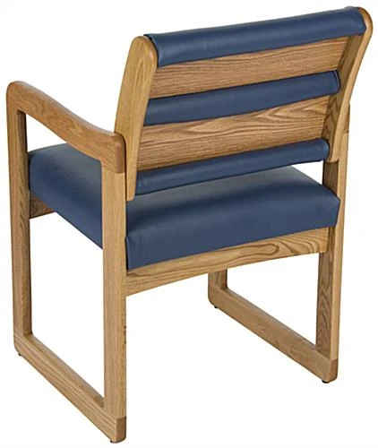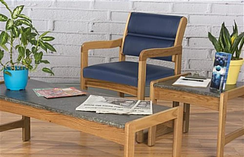 The blue reception room chair is the ideal solution for your business’ waiting area. The furniture features a medium oak wood finish with a vinyl seat and back for your comfort. The wooden reception room chair is extremely easy to set up by simply aligning the side arms to the cushions with the attached slide on brackets. When assembled, the waiting area furniture is highly durable and can withstand a max support weight on the seat and back of 400 pounds. The chair offers a contemporary style which is perfect for coordinating with existing décor. Your floor space will look great with these units and provide your customers an appealing place to sit and relax!