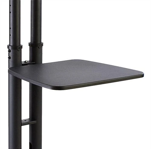 A TV stand shelf offers an open surface to hold electronics, product samples and more. This TV stand shelf, also known as a storage console is a great addition to MB Series Plasma TV stands. The black TV stand shelf coordinates perfectly with the black finish of the flat panel Plasma TV stands. A TV stand shelf can be utilized in many locations, from hotels (holding DVD players) to medical laboratories or hospitals (holding heart monitoring equipment or other electronics). This flat panel TV stand shelf is the smaller of two storage shelves offered, but it is still plenty large enough for various uses. A storage console, TV stand shelf measures 19-1/2″ wide along the front edge and 16″ wide along the rear edge, and is 15-3/4″ deep.