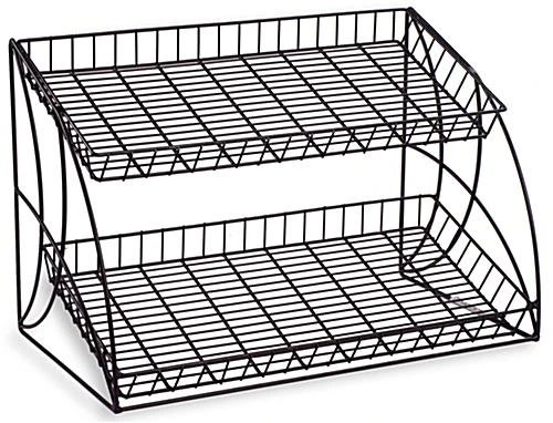 This wire metal rack is designed specifically for use on a counter or tabletop area. This tiered display is fabricated from durable wire with a powder coated black finish. A storage stand, wire metal rack is versatile and functional for use in any retail environment. The design of this countertop display allows a large quantity of items to be offered without consuming a lot of valuable merchandising space. Create a successful point of purchase presentation with this wire metal rack. Most any type of small products can be placed in these trays. A wire metal rack is commonly seen in supermarkets, convenience stores, pharmacies, bakeries, restaurants and cafeterias. Use this metal rack to display food packages or snack bars on the tray and place it near the check-out areas to catch buyers’ attention.