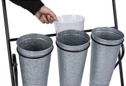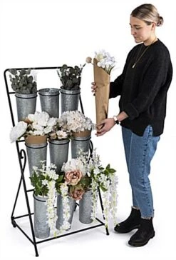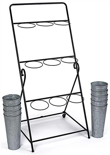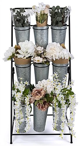 This 3-layer flower bucket rack has nine compartments allowing you to showcase a wide range of bouquets and greenery at your floral shop, garden center, or market. Our rustic floral display holds up to 0.9 liquid gallons in each 6.25″ W x 13.5″ H container and comes with plastic liners to prolong the galvanized vessels’ life and provide protection against leaks. This vintage-looking 3-layer flower bucket rack has overall dimensions of 21″ W x 24″ D x 50″ H with a sturdy powder-coated frame. The base has two non-locking wheels on the back and two plastic capped feet on the front, allowing the unit to be stable yet portable. Bring this rustic floral display to your curbside during the day to showcase your bouquets to passersby, but be sure to pull it inside at the end of the day as it is not recommended for prolonged outdoor use. Our galvanized 3-layer flower bucket rack is great for small town garden centers and large corporate supermarkets alike, allowing you to showcase your wide range of floral arrangements for customers to browse with ease!