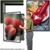 Poster Display Rack – This metal frame poster display is one of our most popular items. This black metal frame floor stand includes a five-pocket adjustable literature rack on one side! The clear acrylic pocket attachment has removable peg dividers allowing you to configure for standard 4″ wide brochures, 8 1/2″ flyers or a combination of the two. The pocket attachment is easily added or removed at any time, with no tools required. The brochure compartments are each 2″d. Post your 22″w x 28″h posters back-to-back against our middle poster-support panel and then use the two non-glare overlays to protect the images. Simply slide the posters and protectors down into metal grooves of this display rack, then load the front compartments with your brochures. Easy to change posters, with out the use of tools.