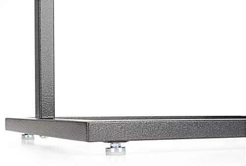 This metal sign holder features a top-loading system, allowing you to change your graphics with ease. Simply slide graphics in from the top slot and slide them down the metal grooves. When printing your graphics, we recommend customers use thicker poster materials, as we do not include the sign holder with plastic lenses or backers. Unlike our MFPH1BLK series (see related products below), posters are held in place only by the grooves in the frame. The graphic slot measures ¼” deep. We also provide the metal sign holder with four levelers for use on uneven floors. The sign holder stand is shipped unassembled, but takes only a couple minutes to set up. We supply the sign holder with the tools required for assembly.