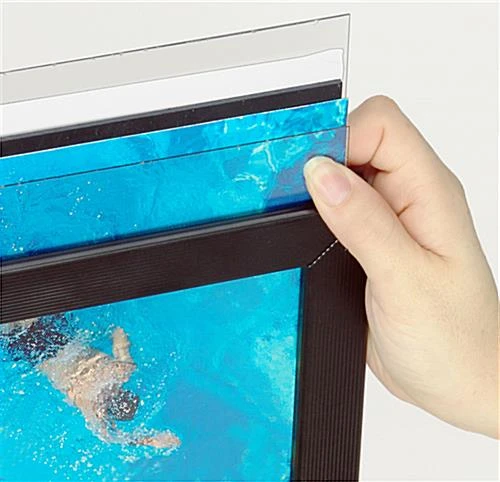 The metal stand, such as this poster display, is constructed from steel and has a black finish. This metal stand has a flat base and two circular legs supporting the frame. Your posters are easily inserted into the frame utilizing the slotted top (see inset image to the right). We provide this metal stand with (2) non-glare overlays and a black styrene backer. The backer panel helps keep your poster crisp and rigid looking while the lens protects your prints from the elements.