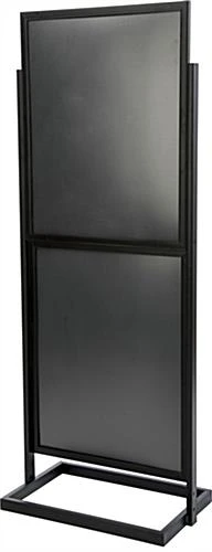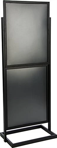 Do you need a metal poster frame that can display several different images in one common stand? Are you working with a limited amount of floor space? This metal poster frame is a popular choice for displaying four different graphics in one display. The black aluminum frame is simple in design, yet is extremely durable. Place this metal poster frame that holds (4) 22″ x 28″ signs near an entry way or in a lobby to promote your products and services. The open-top design allows for quick and easy change outs. To update this metal poster frame, simply place the 22″ x 28″ prints between the non-glare protective lenses and slide down into the groove on the top and bottom sections of the frame. The maximum thickness is 1/8″ which enables users to utilize more durable materials to make graphics last longer.