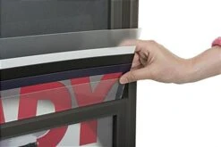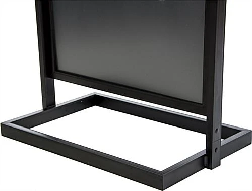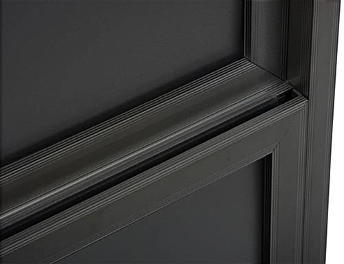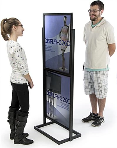 Each metal poster frame also features a middle support panel to ensure signage doesn’t bow or wrinkle inside the framing. This bonus feature allows users to place thinner print material in this unit without having to worry. The metal poster frame with a black finish ships unassembled. One person can easily assemble this sign stand in a matter of a few minutes. Each metal poster frame is shipped with a complete set of assembly instructions. This freestanding sign display is often seen in bank lobbies, shopping malls and large convention centers. This metal poster frame is an effective marketing tool used by businesses all around the world.