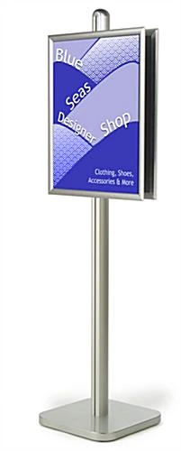 This sign display stand is constructed from bushed aluminum and features a stylish silver finish. The weighted base keeps the entire fixture upright and vertical at all times. The pedestal, without accessories, weighs 25 pounds, which makes it sturdy enough to remain in place in a busy environment, yet still light enough for easy repositioning throughout a room. This sign display stand that is inspired by European fixtures works well in commercial and business settings, such as a retail store or a gym. The floor-standing poster holder requires some initial setup.