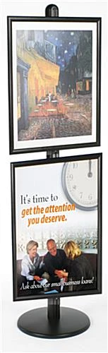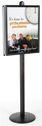 This poster frame stand is an ideal promotional display for showcasing indoor advertisements. The aluminum components will not rust, and are extremely durable. This sign holder, poster frame stand features a 6 foot pole that places the frames at an optimal viewing height. There is a groove down the center of the pole to allow for custom placement of the frames. Each poster frame stand comes in a matte black finish to easily match any environment. The neutral coloring is ideal for any commercial business. Accommodating 22″w x 28″h graphics, this poster frame stand presents your graphics in a modernized manner. This sign display can be used in places like lobbies, galleries, shopping malls, trade shows and banks.