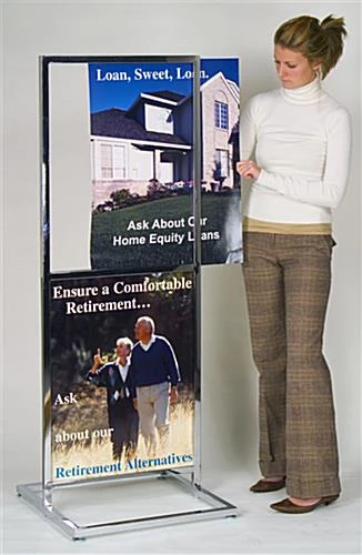 This economical chrome poster stand is imported to offer a low-cost option for our price point shoppers. This poster stand accommodates your 22″ wide x 28″ high posters back-to-back for double sided viewing. The poster stand is two-tier, so you can display up to (4) posters in this single unit. This poster stand loads from the sides; your posters simply slide in and out of the slotted frame without the use of any tools. We do recommend the use of heavier stock paper as this poster stand does not include clear acrylic poster covers or a middle poster support like offered on our own MFPH2CP unit (see related items on this page). With the lesser quality EMPS2CH unit, your poster is held in place only by the edges of the frame, which does not provide the same protection and support as our more upscale models. The viewable area is 20 1/2″ wide x 27″ high and the opening for poster insertion is 1/4″ wide. The chrome poster stand features levelers on the base so you can stabilize it on uneven surfaces. This two-tier design is very popular in retail environments. Put it in front of your store in the mall or to greet customers in your store.
