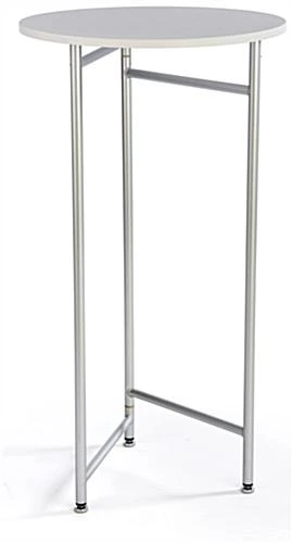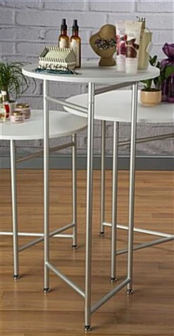 This 44” tall retail table serves as both a merchandising unit for staging products and a highboy banquet display. The diameter and height of the store fixtures make them appropriate for a variety of uses. Place the white finish retail table in a store front to hold jewelry, clothing, or other items. Alternatively, use the merchandising display in a catering facility as a banquet cocktail table. Each retail table features a white PVC wrapped MDF top and aluminum legs with a silver finish. For added cost savings, the legs fold flat for shipping.