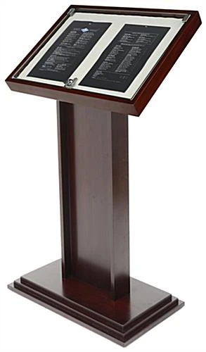 This directory display stand measures 50.25 inches tall and presents information at a slight angle for easy viewing. The floor-standing bulletin board offers a 24 x 18 fabric interior to which various documents, including maps and calendars, may be pinned. In fact, the large-size padded fabric bulletin area can hold up to (4) horizontal 11 x 8.5 sheets of paper! The same area can also accommodate (2) 11 x 17 side-by-side sheets. This directory display stand has a locking, hinged glass door for easy access to the interior presentation space. In-between uses, keep the door locked to prevent unauthorized users from accessing the announcements stored within.
