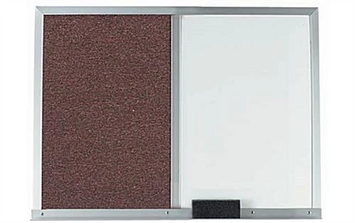 Dry erase tack boards and attached markerboard makes the ultimate communications tool. The total dimensions of the product are 24″ wide x 18″ high. This unit comes with a set of colored markers and eraser ready to use from the box. Includes storage tray to conveniently hold your markers and eraser. The fabric tack board feature a classic brown color, which looks great with the aluminum frame. Hangs on your wall using the included mounting brackets. Recommended for offices, common rooms and lobbies…quickly post and change your messages with this fabric bulletin board. Item ships via UPS or FedEx.