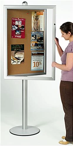 The display surface is cork. The weighted base, pole and frame are constructed from brushed aluminum. Secure your flyers, announcements and other messages on the board with thumb tacks or push pins. The enclosed bulletin board, such as the floorstanding corkboard, has a weighted base for stability. The cork board is a bulletin board with an adjustable height. Easily change the height of the cork board utilizing the groove in the pole and a connector. Initial assembly consists of attaching the base to the pole and the corkboard to the pole. We provide the bulletin board with the necessary installation hardware, push pins and 2 keys.