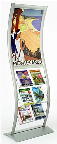 This wave display is constructed from brushed aluminum and has a sleek, silver finish for additional appeal. The aluminum is great for any high-traffic, indoor environment as it is rust-resistant. This image holder is also a double-sided wave display! We provide the wave display with (2) clear, plastic lenses to cover and protect your posters. You can use the wave stand to attract customers in multiple locations. The clear pockets and open design will let consumers browse through your literature easily. The free-standing unit, wave display features adjustable brackets to change the height of each pocket. Also, included with your unit is a 5-pocket literature divider for optional use. This wave display, such as our other wave-shaped fixtures, has a unique appearance to draw crowds to your presentation.