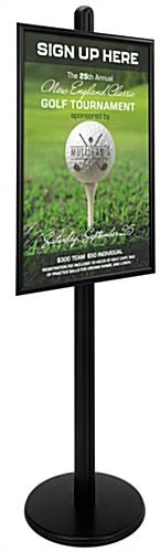 This poster display stand attracts patrons’ attention to signage and advertisements. Each sign fixture stands 6 foot tall, making a lasting impression on passersby and visitors. This poster display stand is made of quality aluminum with a matte black finish. The base is weighted in order to minimize the effects of incidental bumping. Minor assembly is required prior to use. Each poster display stand features three components; the frame, the pole and the base. All of the necessary hardware and tools are included. This poster display stand can easily fit into any large venue like stadiums, lobbies, shopping malls and galleries. Choose from corresponding silver units, also offered in this online catalog.