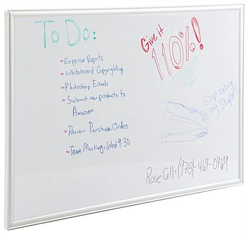 This 24” x 36” whiteboard is wall mounting in either portrait or landscape orientation. Mounting hardware is included for added customer convenience. Use a dry erase whiteboard in a home office for to-do lists or in schools as an interactive teaching tool. The silver frame is made of lightweight aluminum. Each whiteboard also has a beveled edge that adds touch of style to the simple border. You’re bound to love this inexpensive practical dry erase board meant for home or schools.