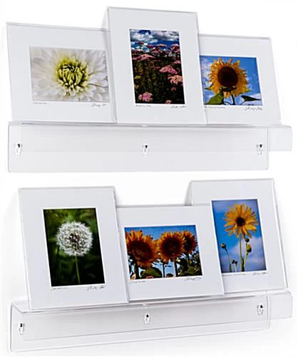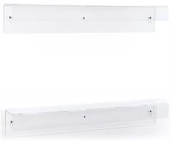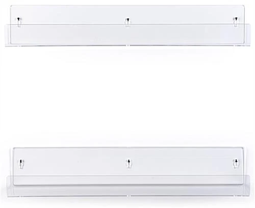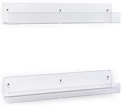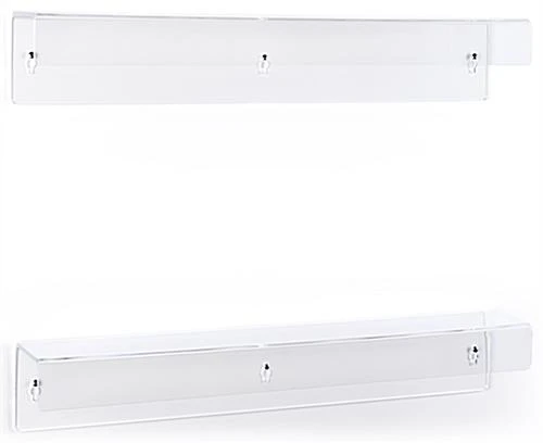 Our acrylic wall shelves blend seamlessly into any merchandising environment without sacrificing the appearance of your showcased items. Crafted from clear 3/16″ thick material, each floating ledge offers an unobtrusive design with clean lines granting customers maximum product visibility. Confidently place merchandise or your most valued items on these acrylic wall shelves with 2″ raised lip that can withstand up to eight pounds of product. Each transparent J-rack fixture features three double-ended keyholes that allow for these two racks to be installed in either direction, resulting in varying merchandising possibilities. Create an array of looks in retail stores, art galleries, schools, and even your home by placing these durable acrylic wall shelves side by side, tiered, with the lip facing up or down. Use these clear floating ledge displays with our coordinating sets of transparent wall-mounted shelving in other sizes (sold separately) to create a full custom visual showcase today!