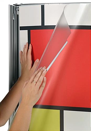 Once assembled, a stiff sheet of PVC (included) is inserted into the inner grooves of the stand display to provide the curved backing of the floor display. Totem poster stand images are protected by a full length, clear Lexan poster protector, which anchors to the stand display with screws on one of the snap rail bars. This lens folds back and there two clamps in place that hold the sign up while users change signage.