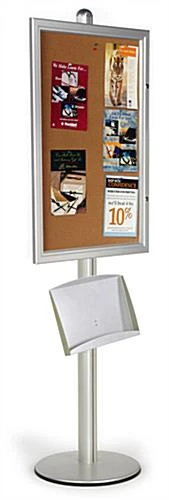 This enclosed cork board, cork bulletin board has a stable, weighted base. The cork bulletin board, such as a directory or enclosed cork board, is made of a modern and attractive brushed aluminum. The board also comes with an 18 – ¼” wide literature tray to display promotional items or sign-up sheets for your advertised events. This cork bulletin board, or enclosed cork board, has an adjustable height and can be easily changed using the side grooves on the pole. (Please view assembly instructions below.) We provide all of the necessary hardware as well as pushpins and 2 keys for the swing-open, lockable frame. We also sell a variety of enclosed bulletin boards and signs with different accessories and features.