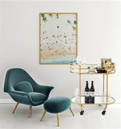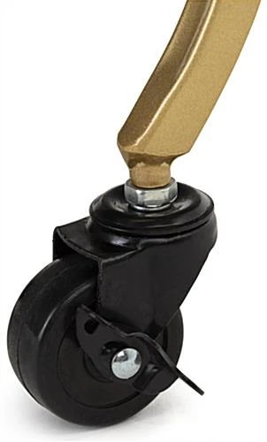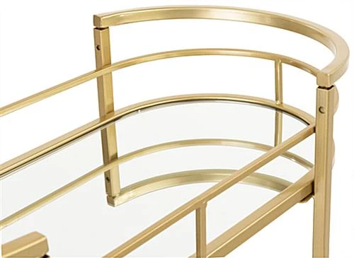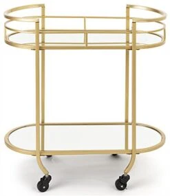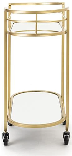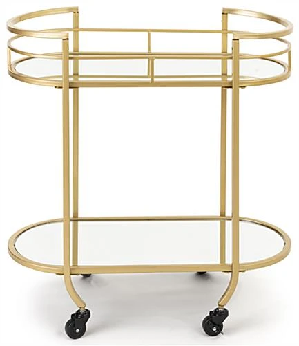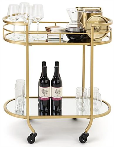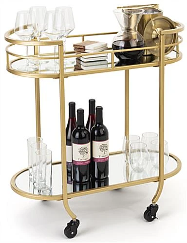 This portable oval serving cart on wheels with gold-toned accents and two-tiered mirrored shelving highlights intricate art deco details for a retro look you and your guests will love. As an essential addition to any entertainer’s space, this beverage display features a wrap-around rail against its top tier to keep wine bottles, stemware, liquor-filled decanters, and other hosting essentials securely in place. Each oval serving cart on wheels has a trendy gold powder-coated finish that adds both style and durability to keep this piece scratch-free for years to come. Crafted with a sturdy iron frame, each rolling display includes two mirrored glass shelves that can support up to 44 pounds of weight. Our portable oval serving cart on wheels comes with two locking and two non-locking casters to offer must-have mobility as this unit is moved from one room to another with ease. Whether it’s used at home or placed within restaurants, bars, or nightclubs, allow this gold-toned beverage display to get your guests into the partying spirit today!