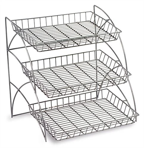 These display fixtures, wire shelving racks add eye catching appeal to your merchandise. Made from durable gauge wire, these wire shelving racks can last for years to come. These wire shelving racks, like store fixtures and metal rack displays, are designed for use on countertop or tabletop areas. Present your products in an elegant way with the wire shelving racks. Finished with a silver powder coating, these wire shelving racks can easily blend with any environment. The wire shelving racks, such as store fixtures and countertop displays are widely used in places like restaurants, bakeries, grocery stores, pharmacies and convenient stores.