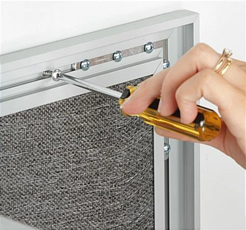 These fabric boards have a contemporary elegance blending with any décor. The aluminum satin frames are beautifully crafted complementing the stylish gray fabric. These boards draw attention to your information in offices, lobbies, entrance areas, classrooms, hallways and vestibules. These fabric boards called enclosed bulletin panels or covered corkboards, are very popular in schools, colleges, universities and office buildings for posting notices.