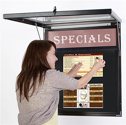 This menu case that is weather proof is safe for use indoors or outdoors. Each unit has a rubber gasket built around the frame to keep the moisture out. Businesses can display their ads outside with this outdoor menu case without having to worry about it getting wet or damaged. Another great feature about this bulletin board is that, each unit comes with a built-in lock. This menu case that is lockable, also known as enclosed bulletin board, can keep the content safe from being vandalized. This swing frame is an effective tool for announcing important information to customers in public facilities, such as churches, libraries, hospitals and government centers. Besides using this outdoor notice board as a communication tool, this menu case also makes a great marketing tool for some businesses. For example, restaurants and cafes can use this swing frame to display food listings or special promotions to invite new potential customers. By displaying this notice board outdoors, store owners can get their message out even when their establishments are closed. Maximize your graphic exposure with this wall swing frame!