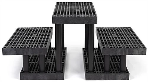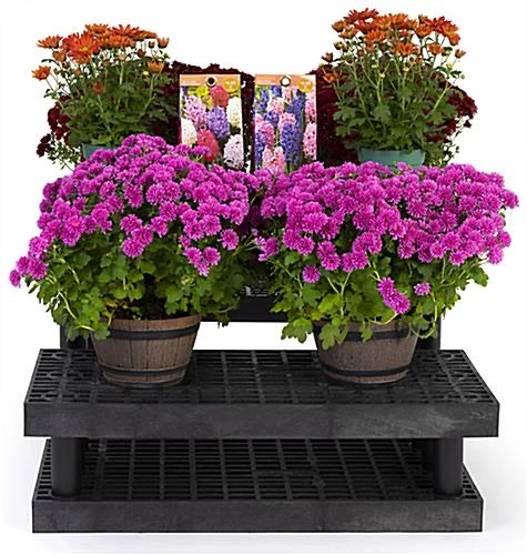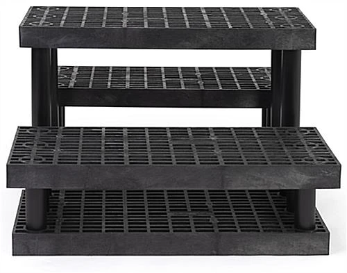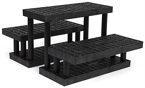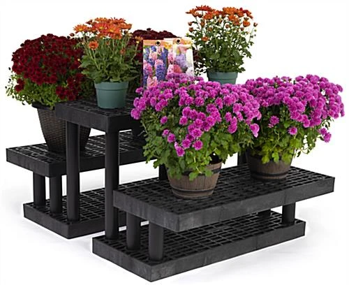 Our tri-level pyramid display is the ideal merchandising solution for farmer’s markets, florist shops, home improvement stores, or any retail space where maximum product visibility is key. Each matte black garden center stand with double-sided steps allows your promotional items to be the main focal point of your showcase for customers shopping from both directions. Configured with high-density recycled plastic, each tri-level pyramid display features a weatherproof design meant to withstand the adverse conditions of indoor and outdoor shopping environments. Perfect for merchandising live goods, fertilizer, gardening tools, and more, this three-step bench has the ability to hold an impressive 1000lbs of product. As seasons change, so do your merchandising needs. Use this tri-level pyramid display with grid top platform individually or pair alongside coordinating fixtures to build a captivating showcase as needs demand. As an added benefit, our double-sided garden center stand is easy to assemble and disassemble, making temporary or permanent setups a breeze. Whether placed inside or outside your establishment, this three-step bench will make it easy to stage your best seasonal items and live goods all year long!