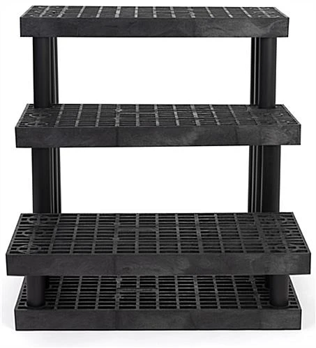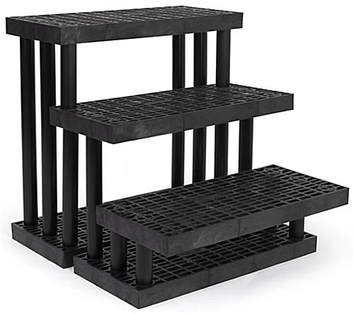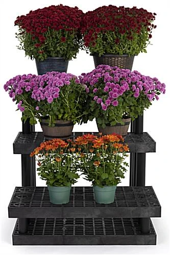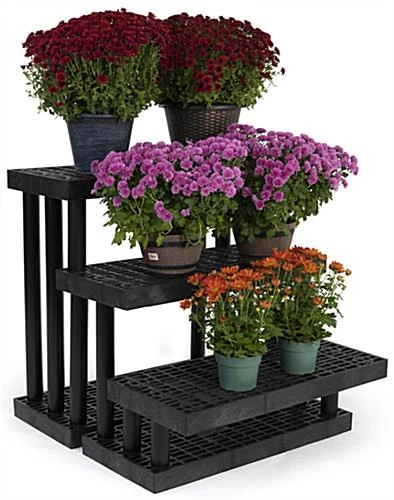 This 3 tier outdoor display is made of heavy-duty recycled plastic with a maximum weight capacity of 900lbs, making it great for showcasing a wide variety of products around your retail space. Ideal for home improvement retailers, supermarkets, greenhouses, and service stations, this versatile garden center bench features a snap-together design that easily assembles within minutes. Use this 3 tier outdoor display with modular design year-round to showcase products like live goods, potted plants, gardening accessories, ice melt, anti-freeze, and so much more! Each three-step merchandising stand features a durable weatherproof design meant to withstand the damaging effects of inside and outside retail environments. This 3 tier outdoor display with varied heights keeps sightlines open at all times and allows for maximum product visibility to pull shoppers in from every direction. Mix and match this modular garden center bench with coordinating multi-level fixtures for a custom showcase that meets your merchandising needs. Place our three-step stand inside or outside your retail space to create a compelling showcase that is sure to grab the attention of passersby.