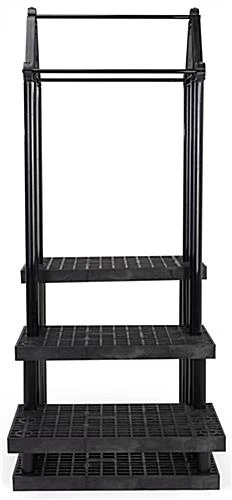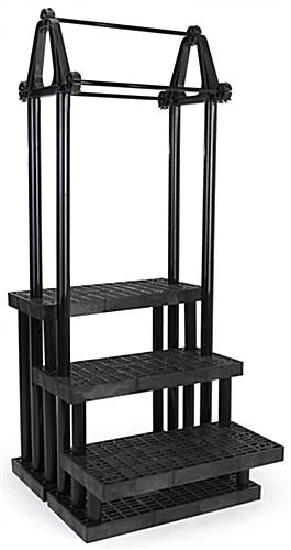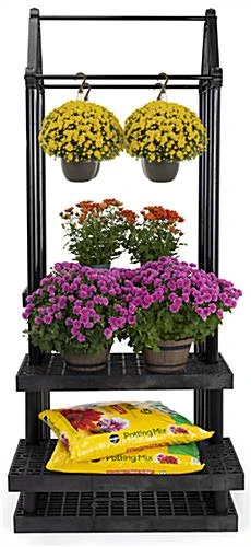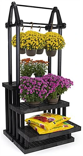 This greenhouse shelving merchandising display measures 36″ wide by 84″ tall, providing you with ample space to showcase live goods, potted plants, and a variety of flowers. Each 3-tiered floral stand features a matte black finish that blends seamlessly with existing fixtures while adding a functional, minimalistic touch to any retail environment. Our greenhouse shelving display with plant hangers creates an impactful showcase that is as flexible as your space demands and easily moves indoors or out throughout the year. Perfect for garden centers, farm stands, and florist shops, each modular three-step rack comes with a 36″ long hanging basket system that can suspend up to 9 plants, maximizing merchandising space and providing more variety in your floral arrangements. Made of 100% recycled plastic material, this greenhouse merchandising display features a durable weatherproof design which holds a remarkable 1200lbs of product and resists the harshest of weather conditions. Our 3-tiered modular flower stand can be paired together with similar fixtures to create a centralized floral area or used individually, giving you the ability to modify your store layout as seasons change. Use this three-step floral rack with hanging basket system in high-traffic areas to have your best-selling greenery and live goods stand out and attract the attention of passersby!