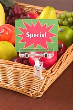 These note displays, clip-on sign holders accommodate signage up to ¼” thick. Clip-on sign holders are fabricated from clear acrylic for durability, lasting for years of use. Place the clip-on sign holders on product bins to attract customer’s attention. These store displays are the most economical and valuable clip-on sign holders to advertise or remind you of important events! These clip-on sign holders, also known as store signs, can be used to display notes, cards, or any other sign you wish to post.