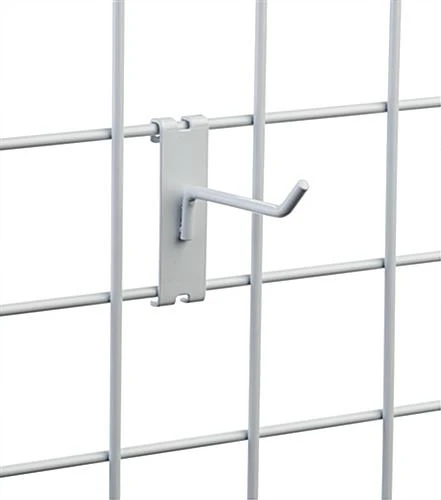This 4” white wire grid panel hook allows customers to quickly scan a selection of products on display. These metal hangers feature a 30° angled tip to help secure items in place on the store fixtures. Sold as a set of 25, the small wire grid panel hook provides a space-saving option to display a variety of merchandise.