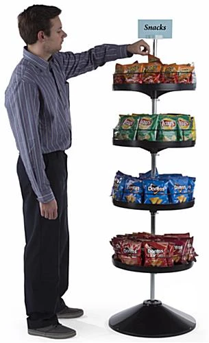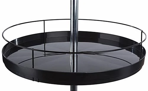 This spinning tray display stand is the perfect way to organize and show off products to customers as they wait in line at the grocery store or enter your retail shop. Each tier spins for consumers to easily admire selections of goodies while the safe guard around the perimeter keeps them from flying out. On top of the black display stand is a clear sign holder for promoting new items or the low price of potato chips and plush teddy bears, bringing customers in. Provided with the rotating rack are 4 clear, adjustable security clamps that make it easy to remove levels or make room for products of all heights. With a solid round base and reaching 63” high, it has the ability to stand on its own. Each rotating shelf is 18” in diameter, allowing them to hold a variety of products on every tier. Use this display stand at the store front for bringing customers in or to sponsor attention-grabbing items.