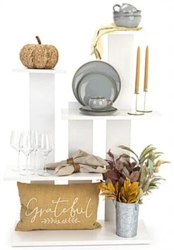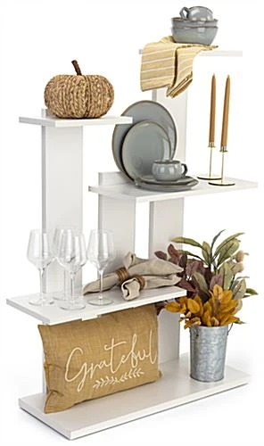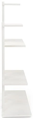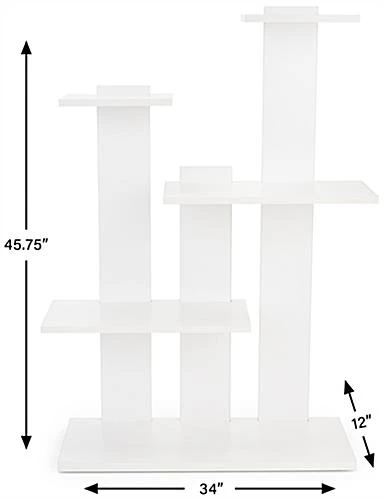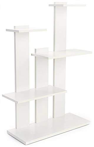 Our 4-tier merchandise shelves is an ultra-modern display solution perfect for retail stores/windows, showrooms, or boutiques. The unique asymmetrical design of this large floor standing shelving fixture allows your products to be the main focus of any presentation without clashing with the decor style of any space. Our 4-tier merchandise shelves are made of a durable particle board frame with a laminated white finish to endure the damaging effects of a busy retail environment. Each multi-tiered stand has overall dimensions of 34″W x 12″D x 45.75″H, resulting in ample space for displaying best selling or key promotional products including housewares, clothing, shoes, accessories, and more. Reinforced with protective rubber feet, these 4-tier merchandise shelves can easily be moved around for visual updates without subjecting the floor to scratches or scuffs. Stage this large floor standing shelving fixture within your location to create a fully modernized retail display that will make your inventory stand out!
