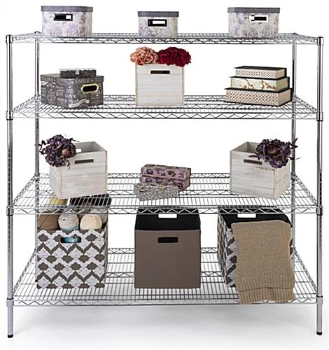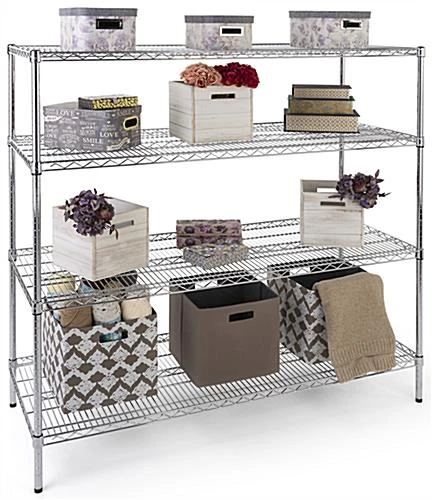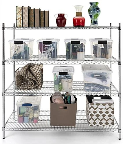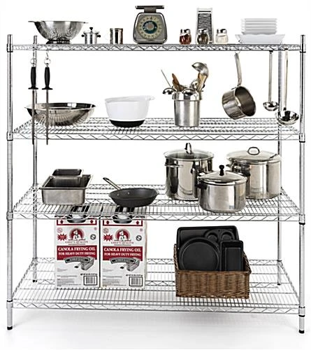 This chrome commercial wire rack shelving is ready to handle all your high quantity and heavy load storage needs. The NSF certified industrial grade display features four heavy-duty 24” deep tiers, 16 clips that make these levels adjustable, 1.20” pole frame, and protective plastic feet. Use this commercial wire rack shelving in a variety of settings, including kitchens, storage rooms, garages, and retail spaces. With a weight capacity of 330 lbs per tier, this display offers plenty of space for anything you want to keep off the floor but still within reach. Optional locking wheels and acrylic insert (sold separately), make this industrial grade storage unit transportable and allows you to store small merchandise. Let this commercial wire rack shelving with chrome finish organize and simplify your work environment.